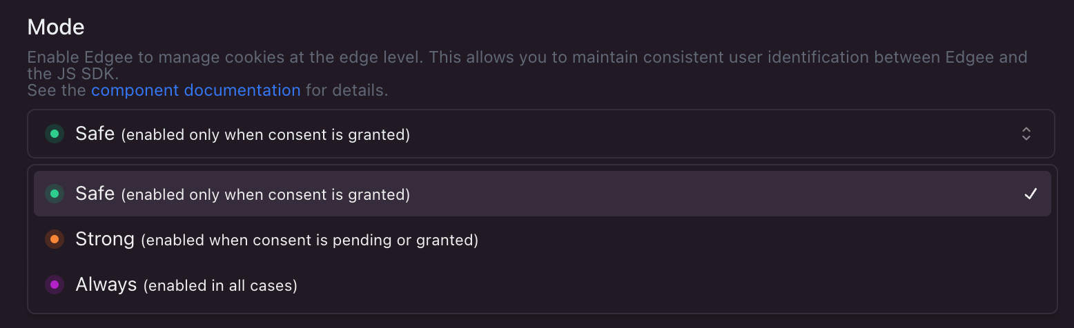 edgee/google-analytics-native-cookiesfrom the list of available components. - In your component settings, configure the mode: